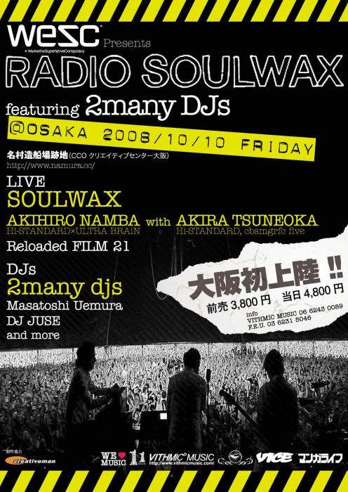世界に名だたるスーパーDJデュオ2 many djsのブレインであるStephen Dewaele と David Dewaele兄弟が中心となって結成したバンドがSoulwax。1995年に結成されて以来、メンバーを変えながらも着々と頭角を現し、現在では世界中のフェ スティバルのヘッドライナーとして名を連ねる。2002年に2 many djs名義でリ リースされた“As Heard on Radio Soulwax Pt.2”で世界の度肝を抜くと2005年にリリースされたオリジナルアルバム“Nite Versions”でその地位はカリスマティックな存在へ。2008年には邦題、“リミックス天国”を発売し、日本でも異例の好セールスを記録。また現在彼らの過去3年間の世界ツアーの記録をまとめ たライブミュージック&ドキュメンタリー映画“Part Of The Weekend Never Dies”がロンドンのRoyal Festival Hallを皮切りにヨーロッパで公開中。 Soulwaxのメンバー自らと、若き映画監督Saam Farahmandが作り上げたこの力作は、ミュージックビデオとドキュメンタリーの2本立て。彼らがツアー味わった、喜びや高揚感。その反動としておきる、疲労や迷い、矛盾、ホームシックから些細なジョークまでが映し出され大きな賞賛と呼んでいる。良き仲間でもあ る、James Murphy, Nancy Whang, Erol Alkan, Tiga, Justice, Busy P, So-Me, Peaches, Kitsune, Klaxonsなど早々たるメンバーがSoulwaxへの想いを語るシーンもある。まさに世界の中心に躍り出た兄弟デュオがSoulwaxとして2006年7月以 来、実に2年ぶりの来日を果たす!!