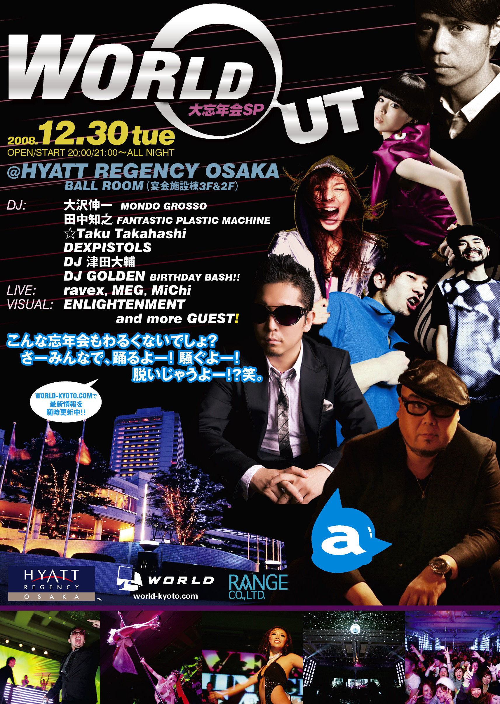 大阪南港のハイアットのボールルーム(宴会場)は奥行95M、幅35Mと約35名が一斉に100M走ができるほどビッグスケール!しかも床は高価な絨毯。そんな会場が12/30に一夜限りのスーパークラブと化す!昨年のカウントダウンでは2500人以上動員を記録し大盛況となった。今年は12/30のカウントダウンイヴに開催。昨年以上に旬な豪華ゲスト陣が出揃うなかでも見所は、“大沢伸一、田中知之(FPM)、☆Taku Takahashiの3人によるスーパーユニットravexの関西初LIVEや今年話題のアーティストMiChiのライブでしょう!大盛上り必至確実の12/30WORLDOUTを大いに期待してお越しやす~~。